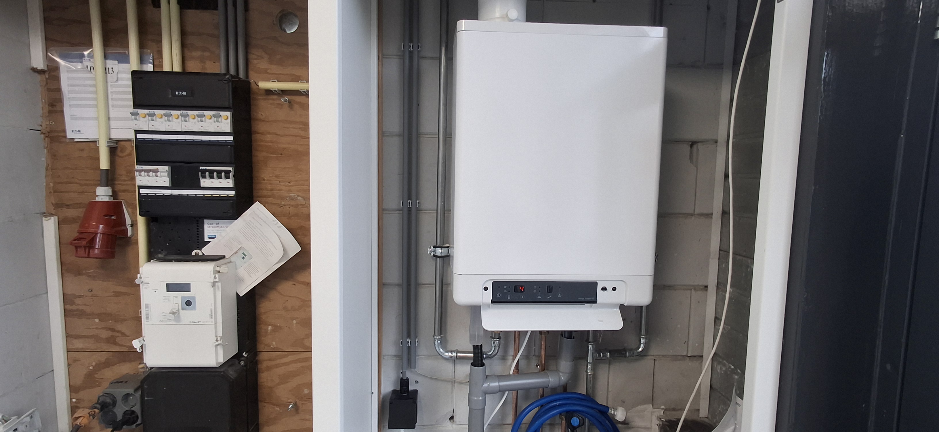 Via de loopdeur is toegang tot de hal met meterkast, toilet en de trap naar de etage. De aansluitingen voor gas, water en elektra zijn aanwezig.