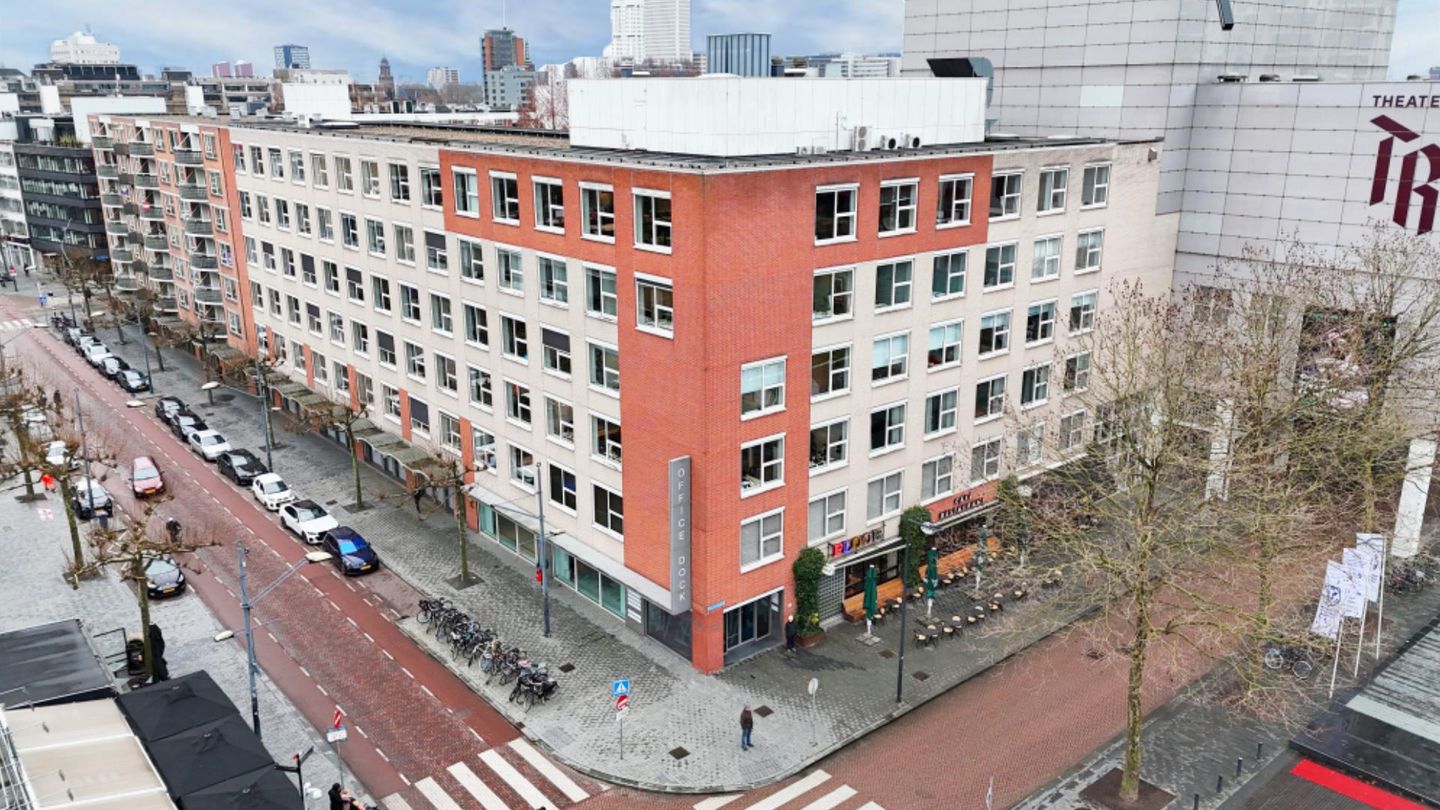 Het kantoorgebouw ‘Office Dock’, gelegen op de hoek van het Schouwburgplein en de Karel Doormanstraat, betreft een representatief en duurzaam multi-tenant kantoorgebouw op een prominente locatie in het centrum van Rotterdam. Vanuit het gebouw geniet men van een uitstekend uitzicht over het levendige stadsplein. In de directe omgeving bevinden zich diverse hoogwaardige voorzieningen, waaronder retail- en horecagelegenheden, bioscoop Pathé, de Theater Rotterdam Schouwburg, concertgebouw De Doelen en overige Leisure voorzieningen. Dit maakt de locatie bijzonder aantrekkelijk voor zowel medewerkers als bezoekers. De representatieve hoofdentree wordt gedurende kantoortijden bemand door een receptioniste en draagt bij aan een professionele en gastvrije uitstraling. Een belangrijk pluspunt is de aanwezigheid van een eigen parkeergarage met een ruime parkeernorm, wat het gebruikscomfort en de bereikbaarheid van het gebouw verder versterkt.